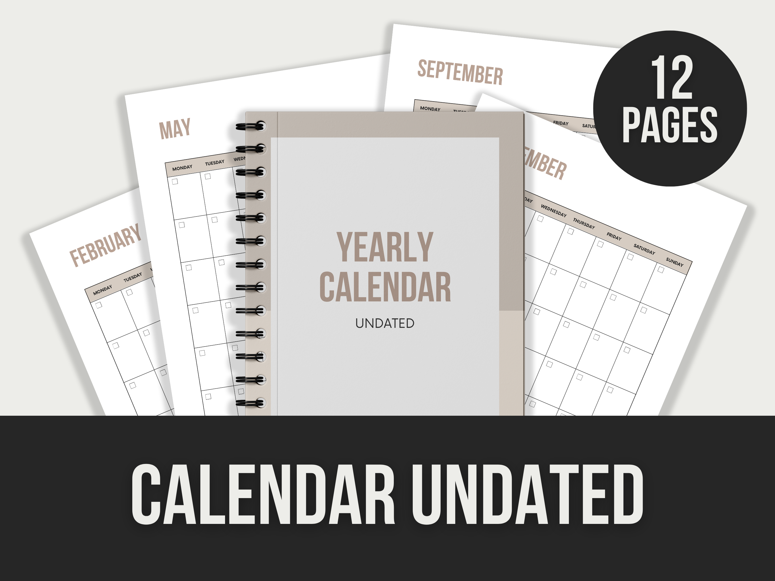 The “Undated Calendar” includes 12 editable Canva pages for creating versatile and reusable calendars. Mockups shown are for demonstration purposes only and are not included