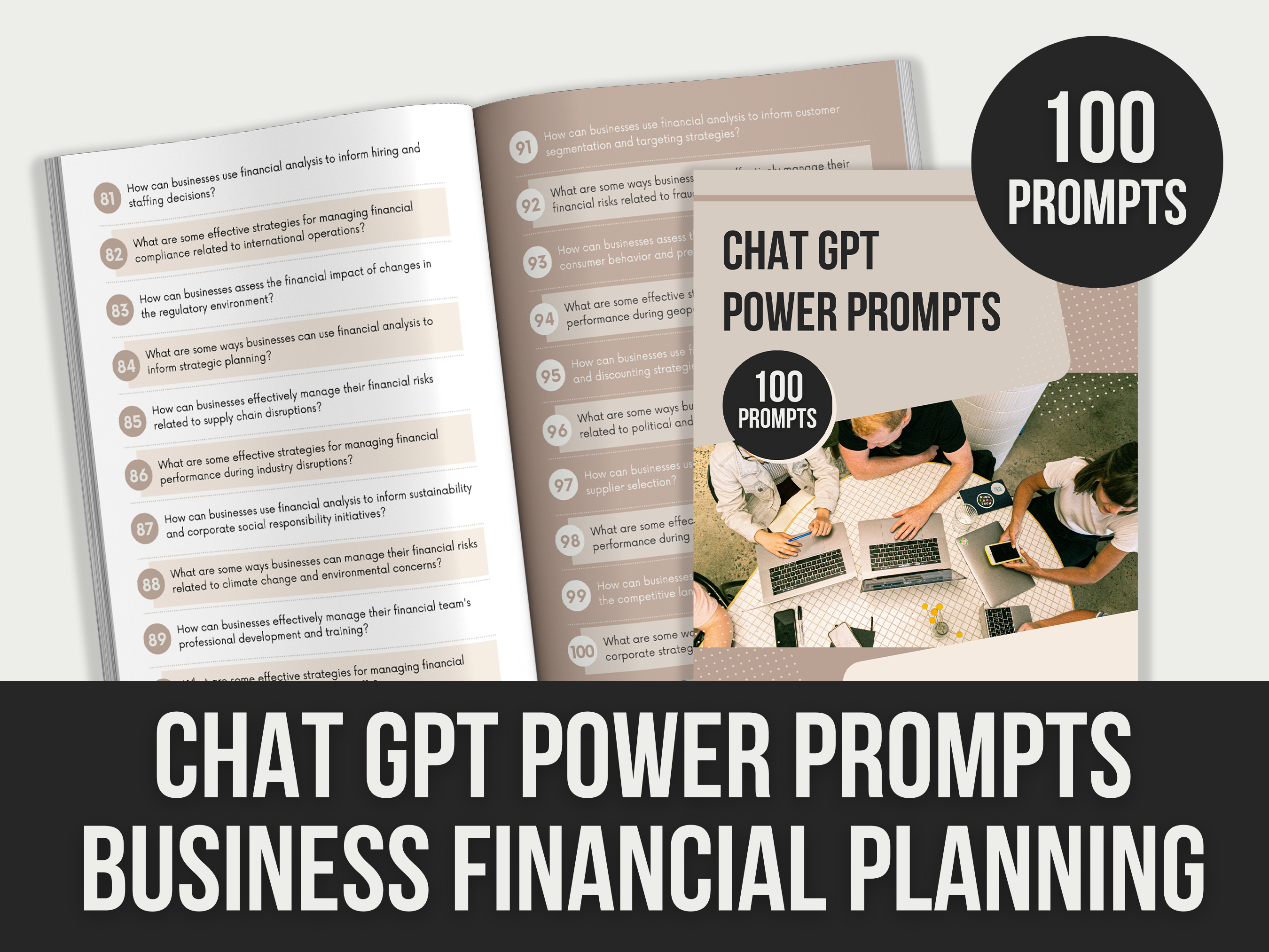 The “ChatGPT Power Prompts: Business Financial Planning” is an 11-page editable Canva template featuring 100 expert-crafted prompts to guide businesses in managing finances effectively. These prompts help streamline budgeting, financial forecasting, and investment decisions, making them an invaluable tool for business owners and financial coaches.