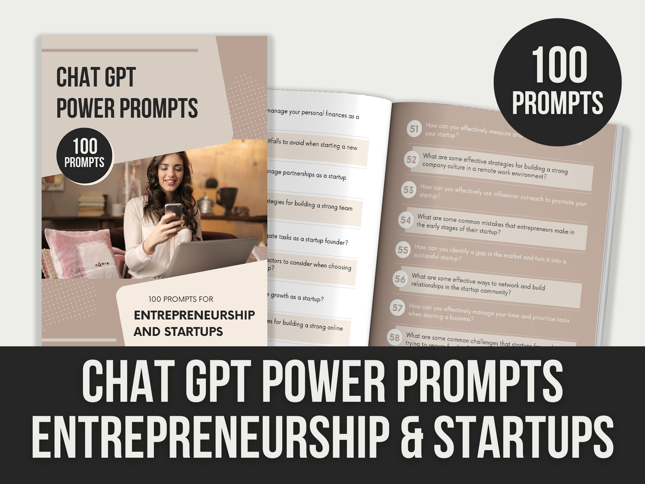 This package includes an 11-page editable Canva template with 100 ChatGPT prompts for entrepreneurship and startups. Product listing mockups are not included.