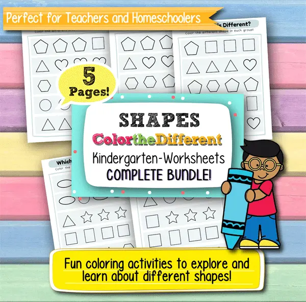 ✔ 5 Printable Pages – Engaging color-the-different-shape activities