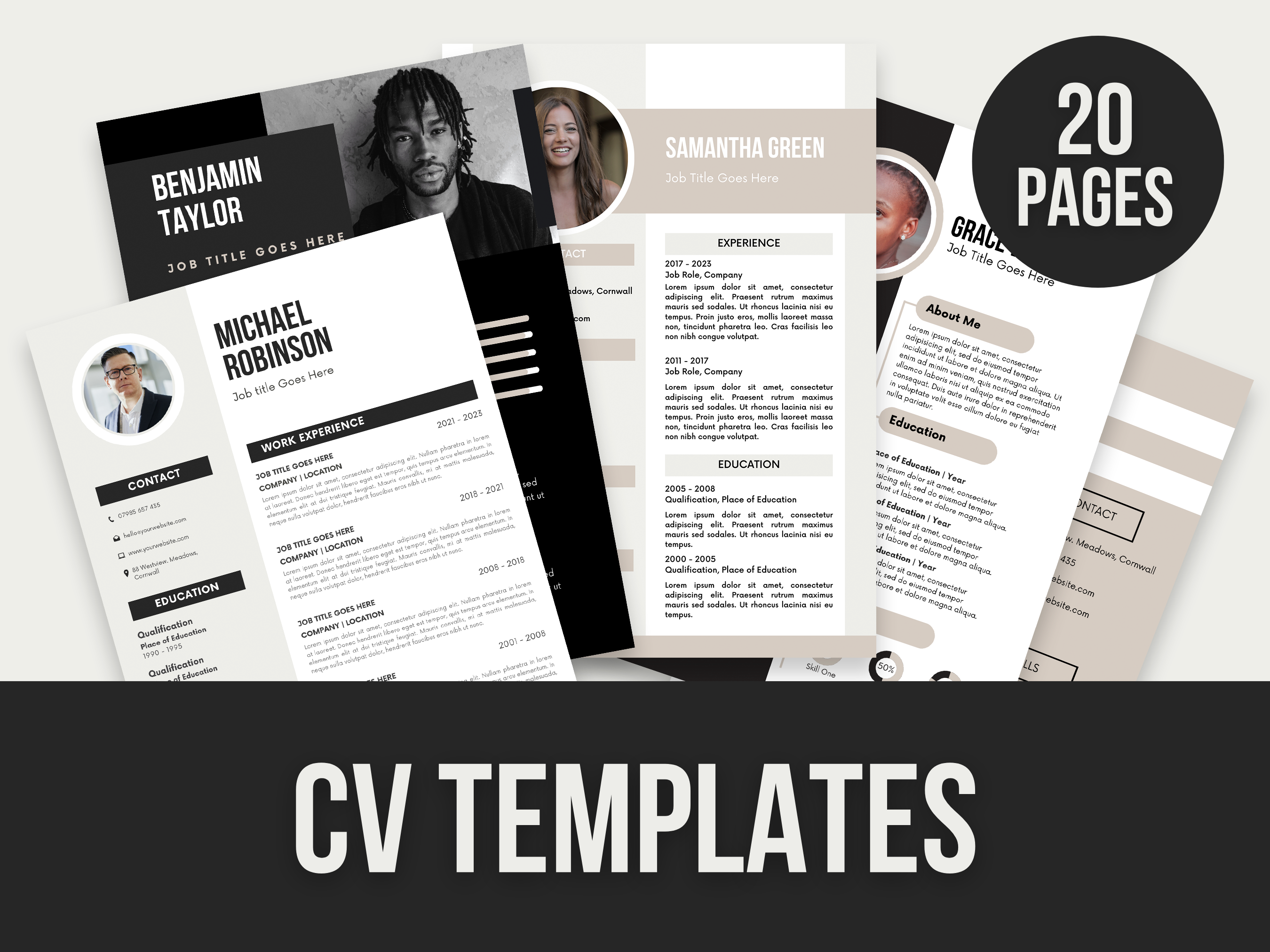 This package includes 20 editable Canva templates for CVs and resumes. Product listing mockups are not included.