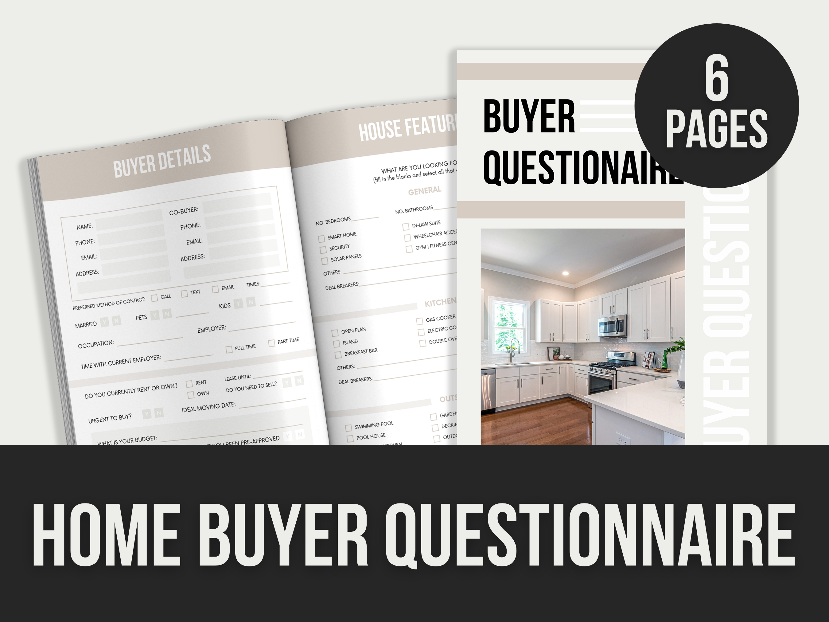 The “Home Buyer Questionnaire” includes 6 editable Canva pages for gathering essential buyer information. Mockups shown are for demonstration purposes only and are not included