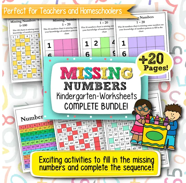 This product includes 20+ printable worksheets featuring missing number exercises ranging from 1-20, 1-100, and 1-130.