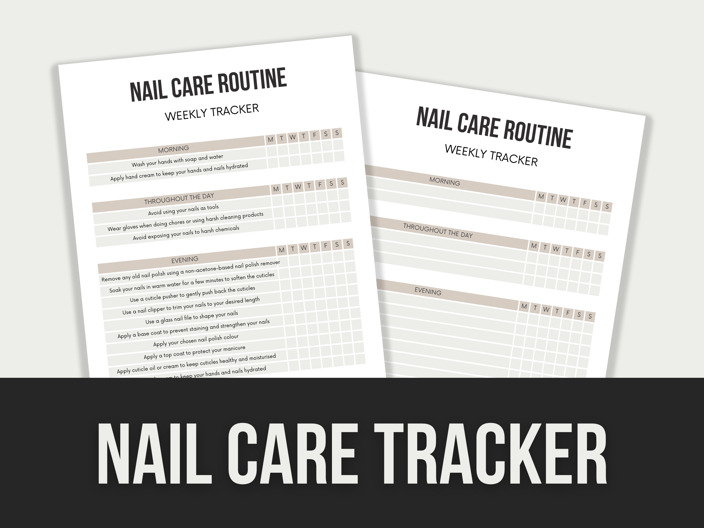 The “Nail Care Tracker” includes editable Canva templates designed to manage and track nail care routines. Mockups shown are for demonstration purposes only and are not included