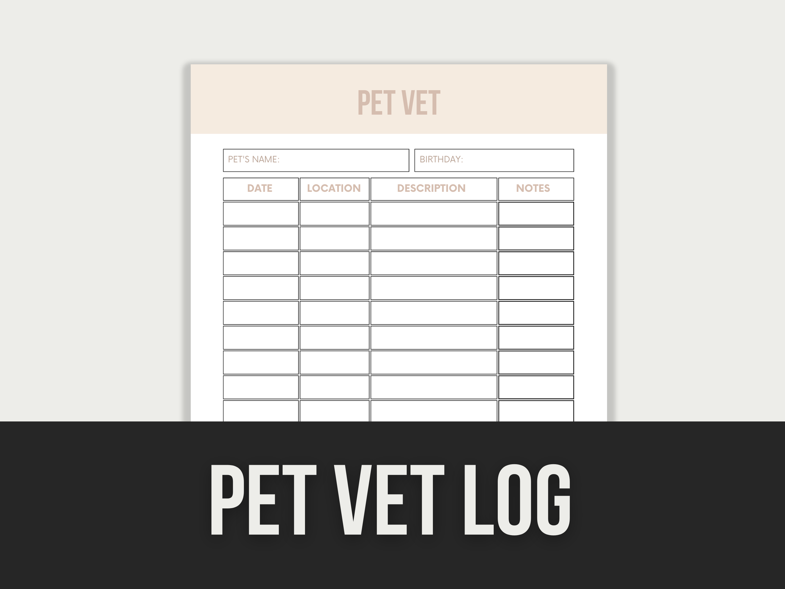 Editable Templates: A pet vet log designed for managing veterinary visits and treatments