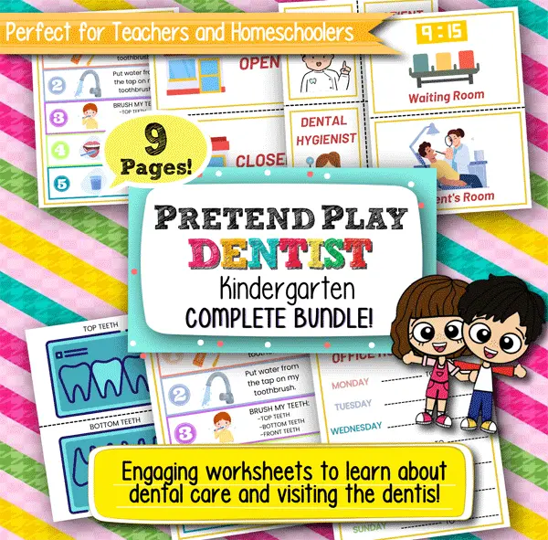Pretend Play Kindergarten Worksheets – Dentist, 9 Pages