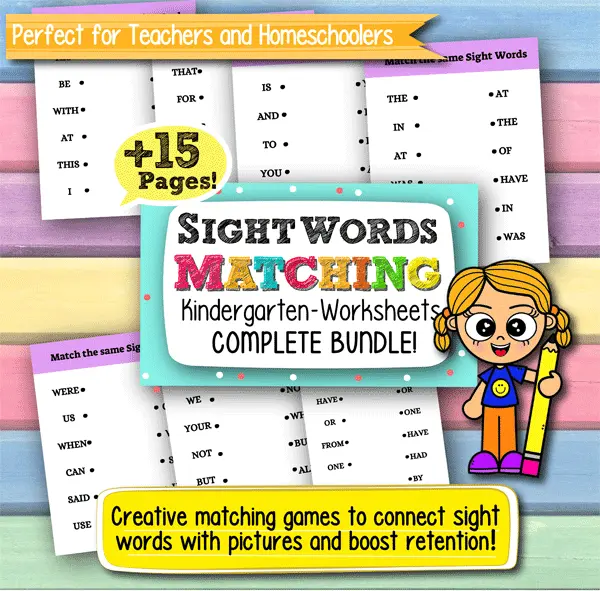 This product includes 15+ printable worksheets featuring sight word matching exercises, helping kids pair and recognize common high-frequency words for early reading success.